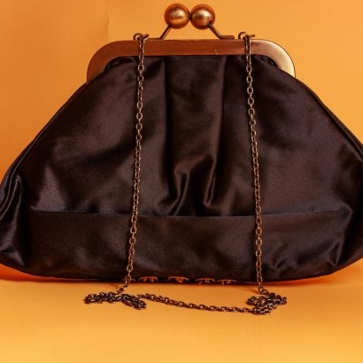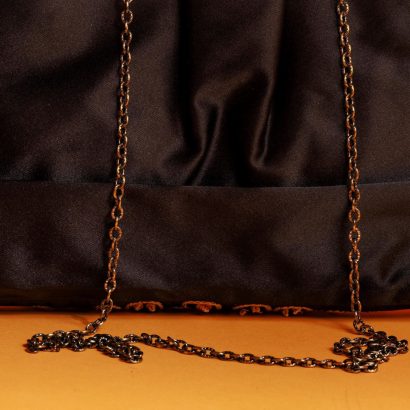 This handbag, crafted from satin and detailed with black and gold embroidery, exudes a luxurious, vintage feel.