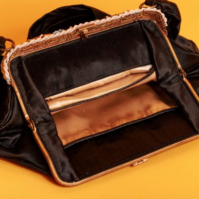 This black silk purse perfectly blends opulence and sophistication, creating a striking statement in a retro-chic style.