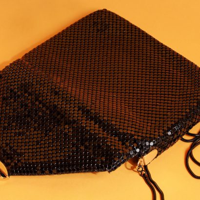 Crafted from a black mesh sequin material, the countless closely arranged sequins shimmer with a captivating shimmer in the light, reminiscent of stars in the night sky, adding a cool and dazzling touch to the overall look, making it an easy focal point. The gold metal hardware on the front contrasts sharply with the black sequins. The delicate snap closure not only enhances the bag’s practicality and secures its closure, but also adds a touch of luxury, adding a layered and visually appealing touch.