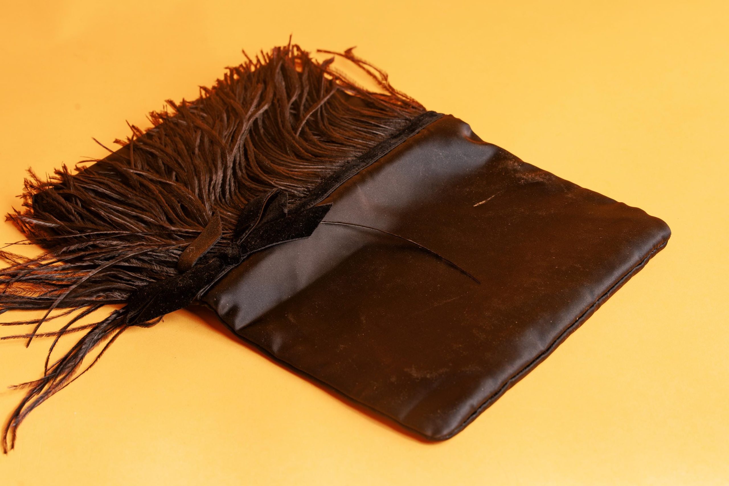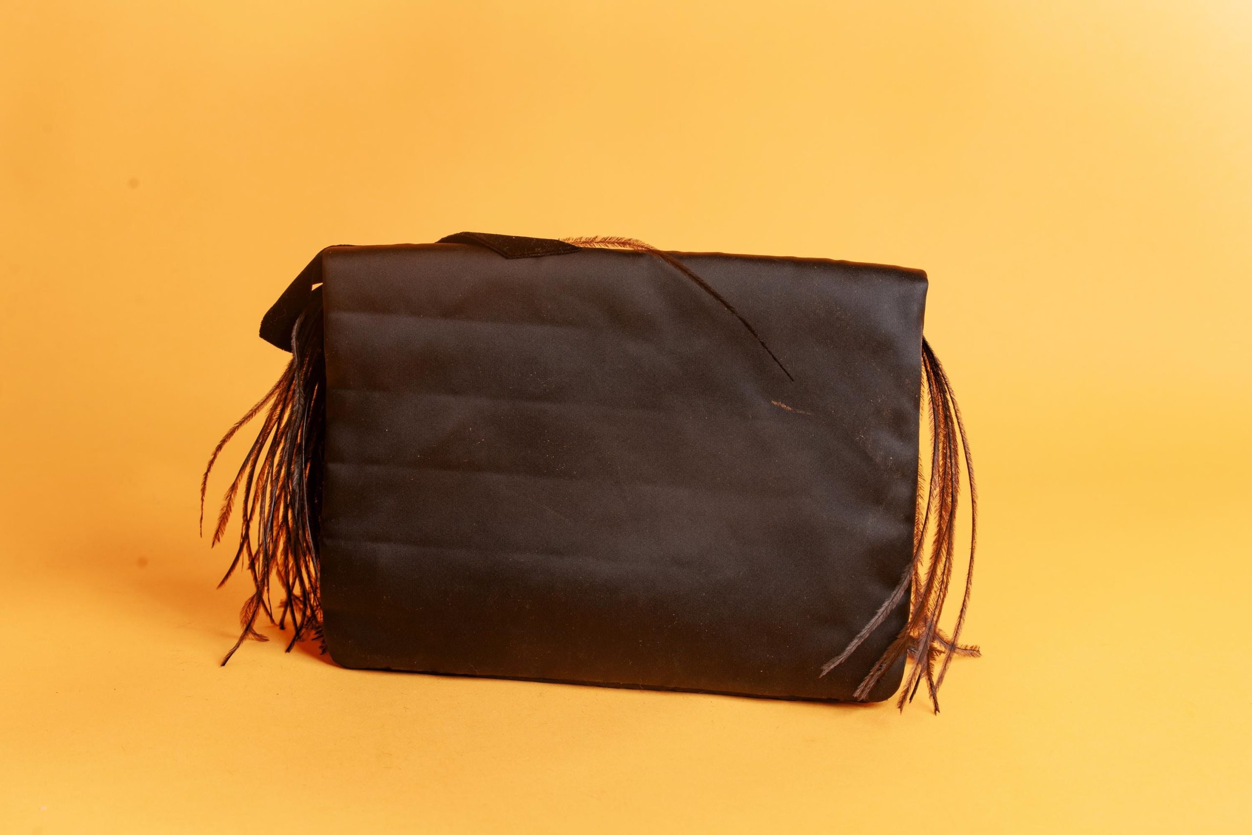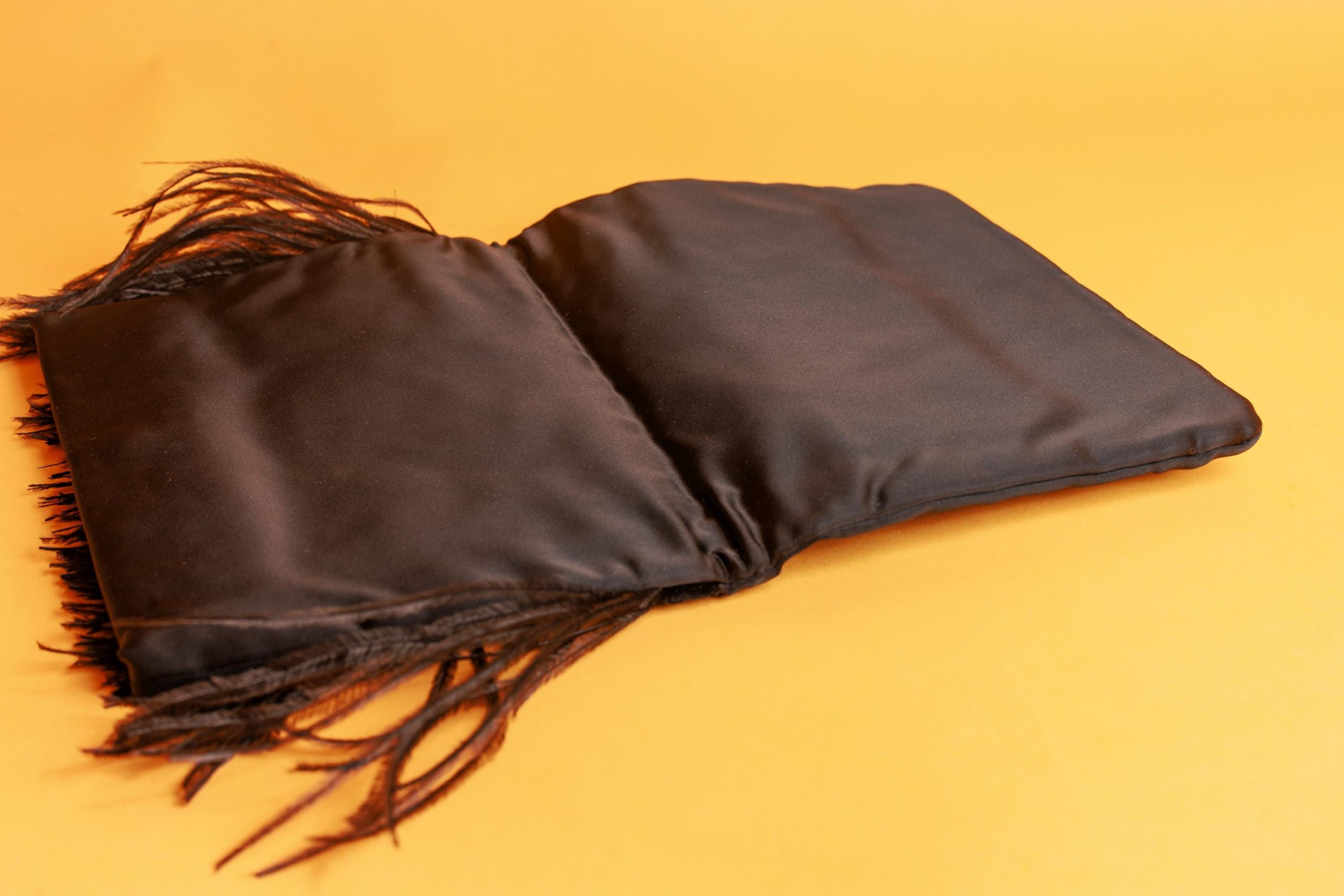 This black wallet, crafted from satin, features feather tassels and a velvet bow, embodying a luxurious, vintage style.