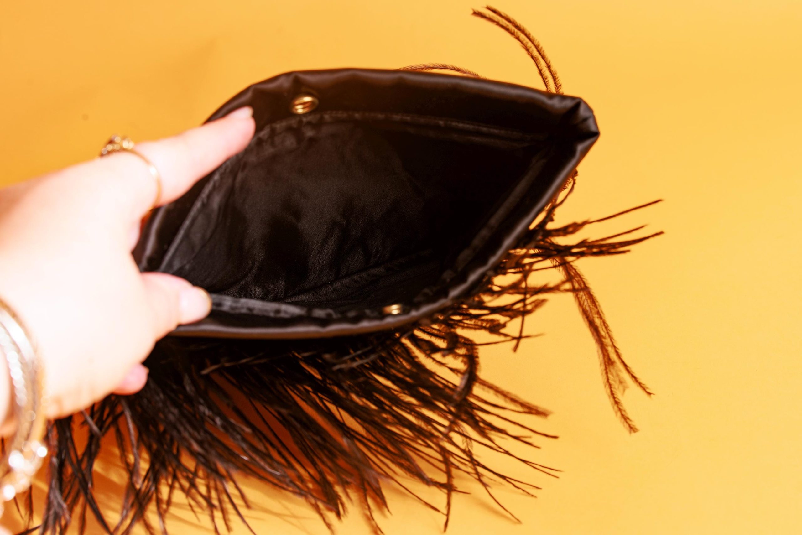 Whether paired with a gorgeous evening gown to attend a grand dinner or party, showing a noble and elegant temperament; or combined with a retro-style skirt, using the feather tassels and bow design to inject gorgeous highlights into the outfit, this black satin feather wallet can be a perfect fit, becoming an excellent choice to enhance the style taste, showing the user’s pursuit of gorgeous and retro style.