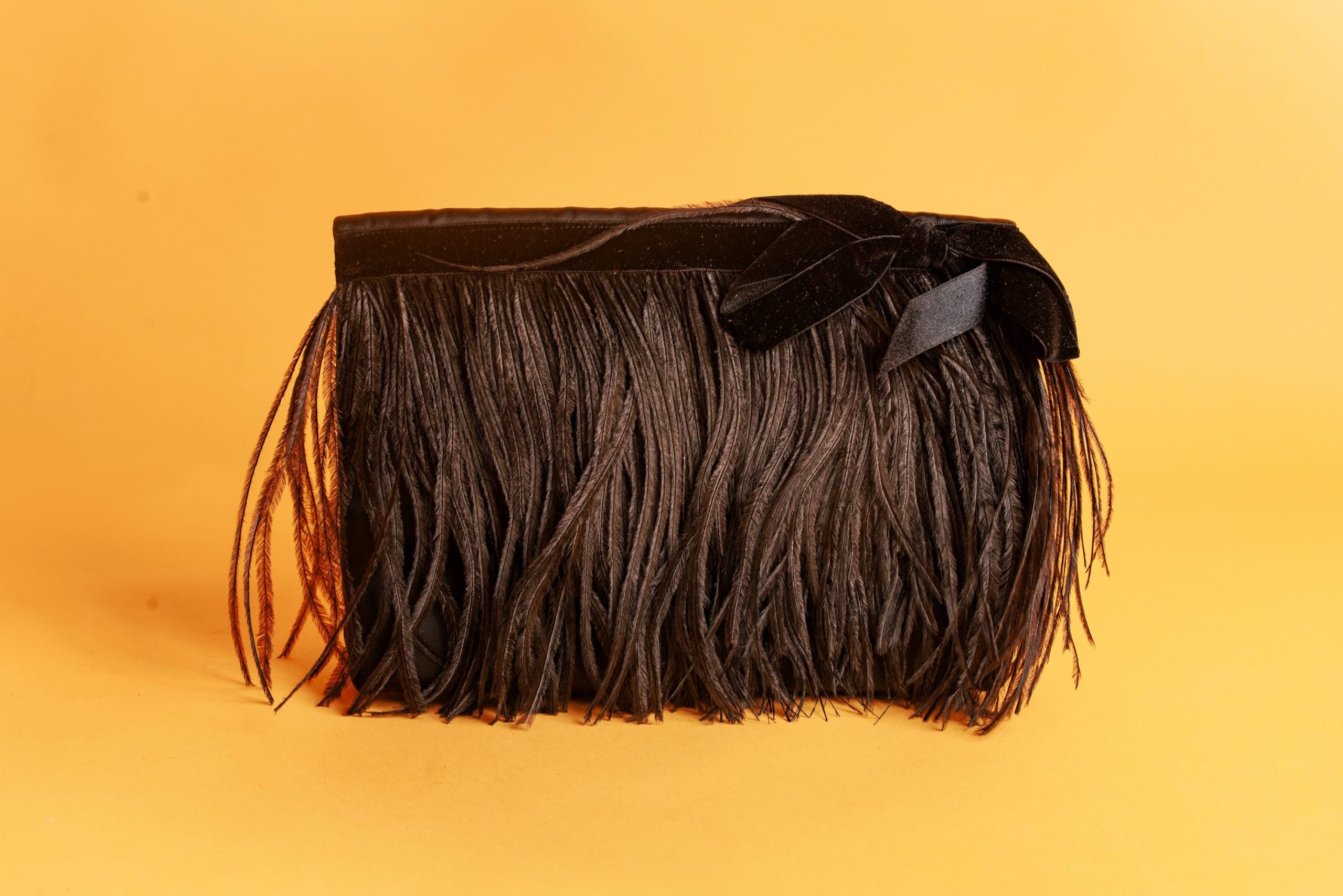 Crafted from a smooth, delicate satin with an elegant sheen, the satin’s classic black hue creates a luxurious, elegant foundation. The long, flowing black feather tassels adorn the bag, swaying gently with movement, evoking a dancing elf in the night. These feathers add a touch of agility and elegance, instantly capturing the eye and becoming the focal point of any outfit. The velvet bow at the top adds a sweet and romantic touch, complementing the feather tassels and adding a layered, visually appealing design.