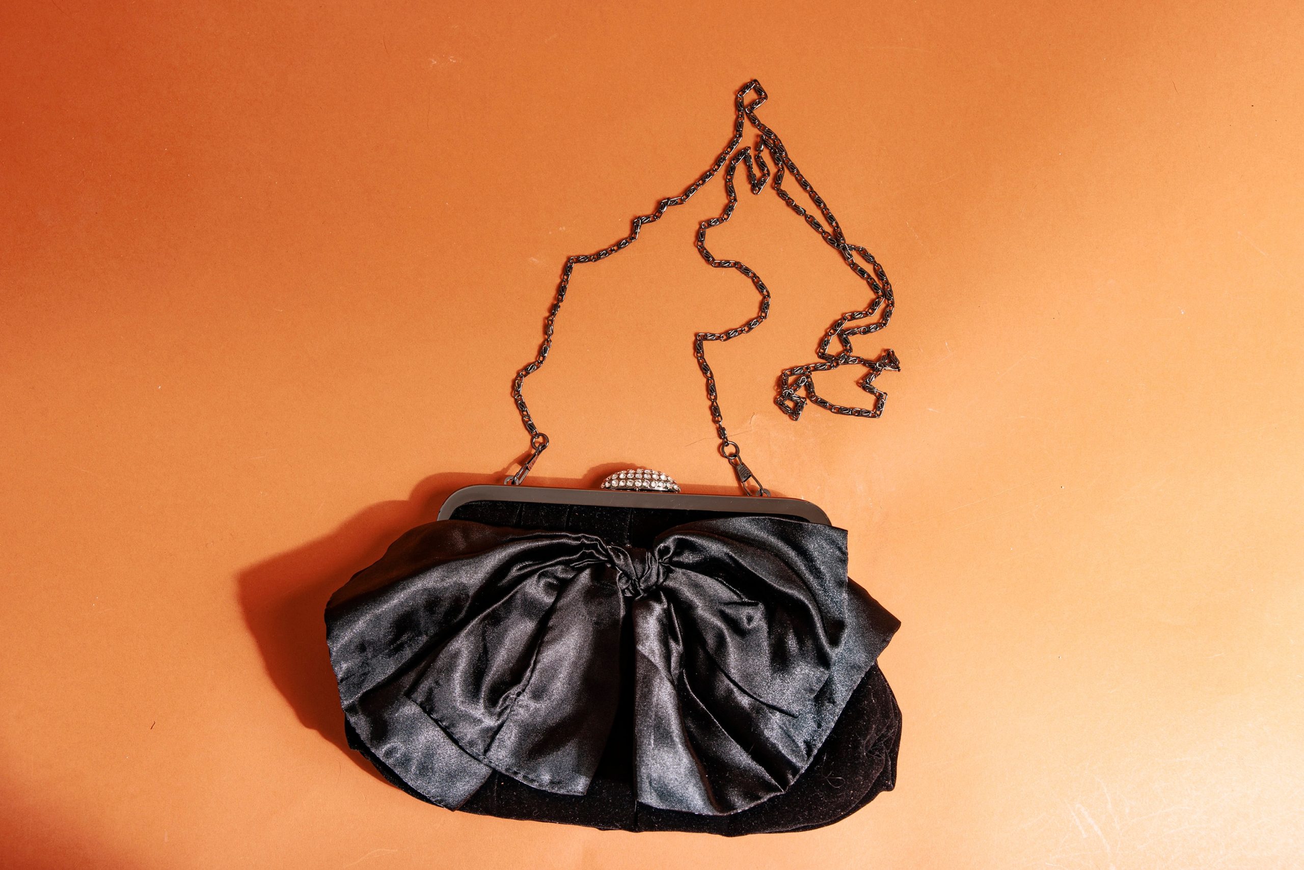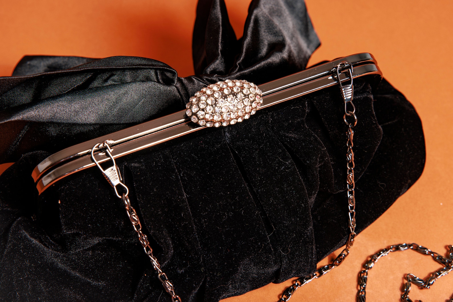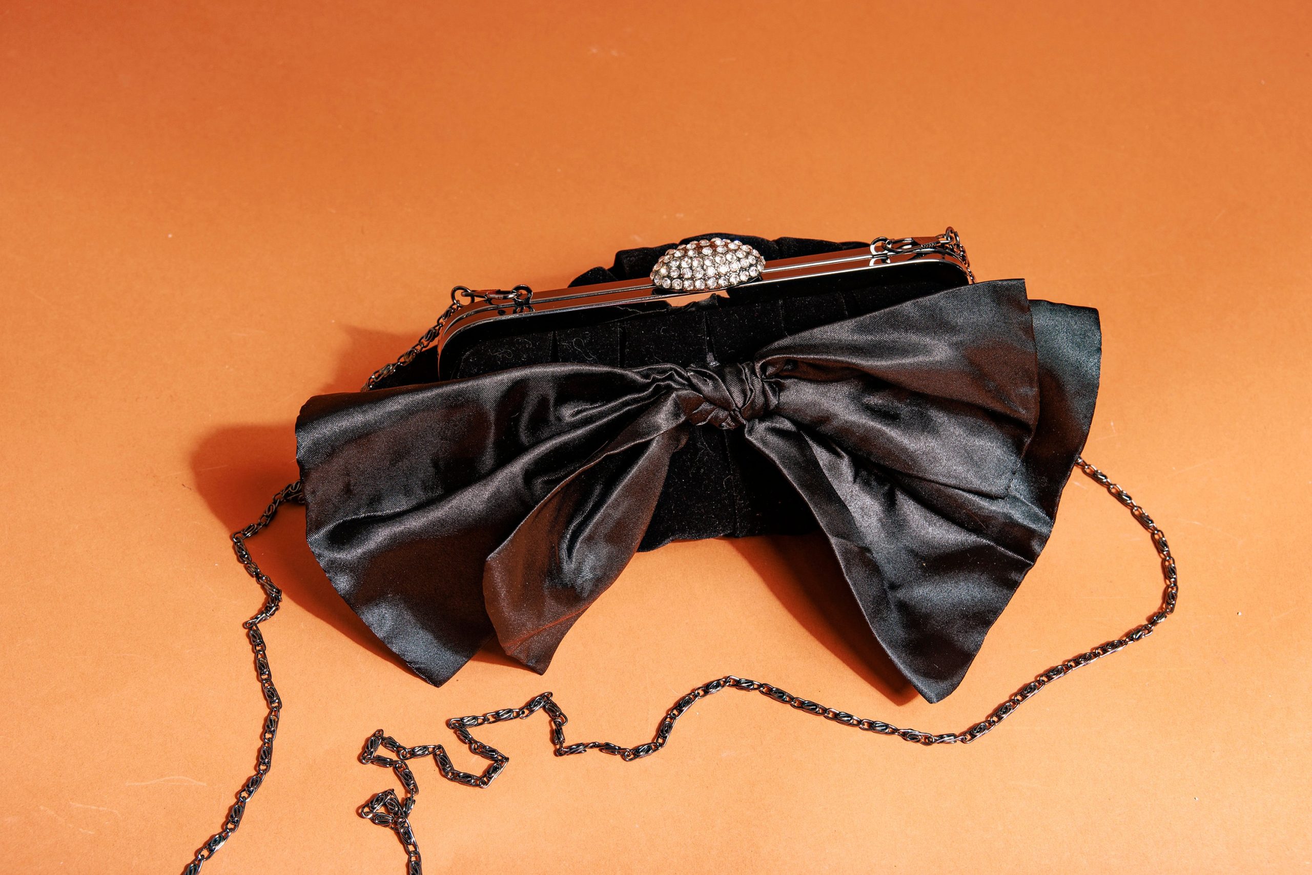 The top is finished with a delicate rhinestone clasp that sparkles in the light, adding a touch of opulence and exquisite detail. The contrasting black velvet and large bow enhance the overall luxurious feel.