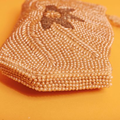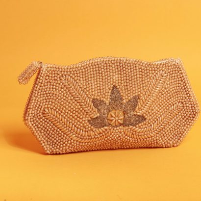 This caramel-colored beaded clutch, with its delicate beading and elegant floral design, is a striking and sophisticated addition to any everyday wardrobe.