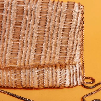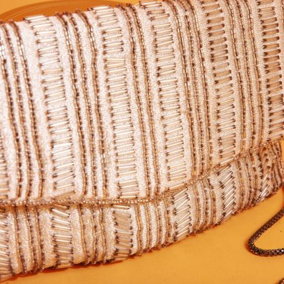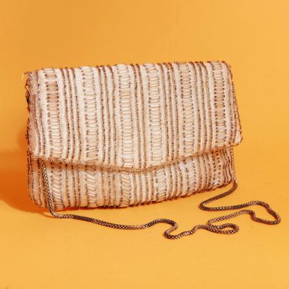 This silver beaded string bag, with its gorgeous design, easily becomes a striking focal point in any outfit.