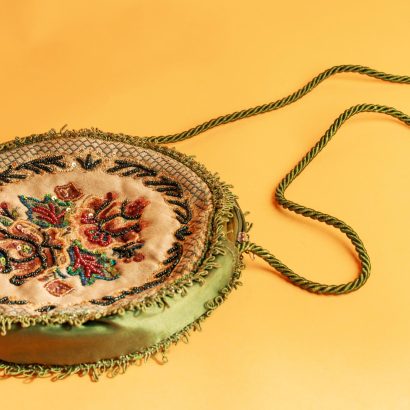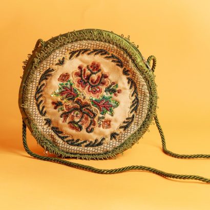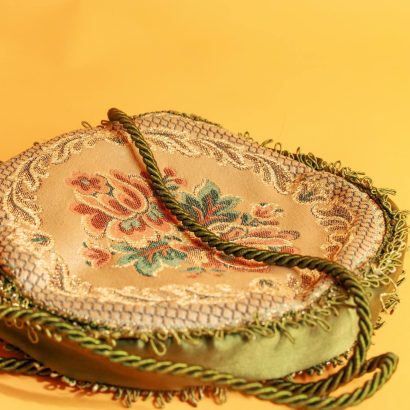 The unique and artistic round shape instantly breaks the monotony of conventional bags. The front is embroidered with a plush floral pattern, rich in color and delicate in texture, resembling quietly blooming flowers, injecting romance and vitality into the wallet, embodying a vintage and elegant charm. The sides are made of green satin, which is smooth and delicate with an elegant sheen, complementing the embroidery on the front, enhancing the overall texture and harmony. The light and flowing tassel trim sways gently with movement, adding a touch of agility and playfulness to the wallet, creating a visual highlight and adding a sense of depth to the overall design.