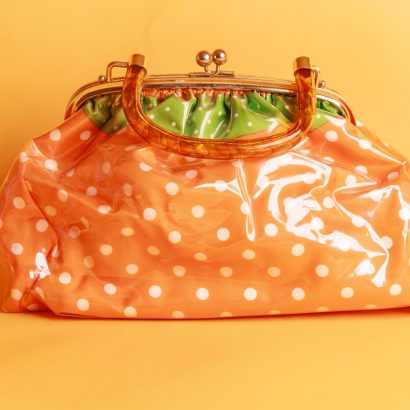 The glossy vinyl exterior offers a smooth, sheeny finish, adding a touch of class and making it easy to clean. The orange and white polka-dot “strawberry” pattern is fresh and lively, seeming to embody the sweetness and energy of summer, instantly adding a touch of bright energy to any outfit and creating a focal point. The green polka-dot lining on the top complements the orange and white polka-dot pattern, adding a touch of sophistication and harmony to the design.