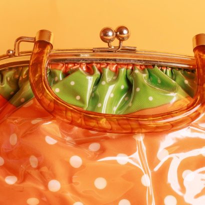 Whether paired with a fresh dress for a sweet and adorable look, or paired with casual denim, the playful orange and white polka dot vintage vinyl shoulder bag perfectly complements any outfit, showcasing a playful, vibrant, and vintage-inspired aesthetic.