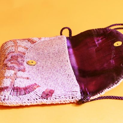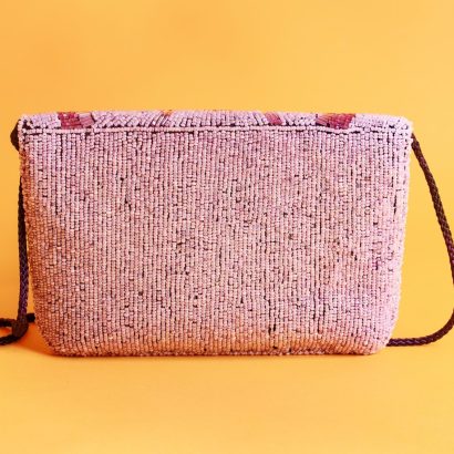 This shoulder bag, featuring pink and lavender as its primary colors, blends geometric Art Deco with beadwork, exuding a vintage charm and making it a highly recognizable, eye-catching piece for any fashion ensemble.