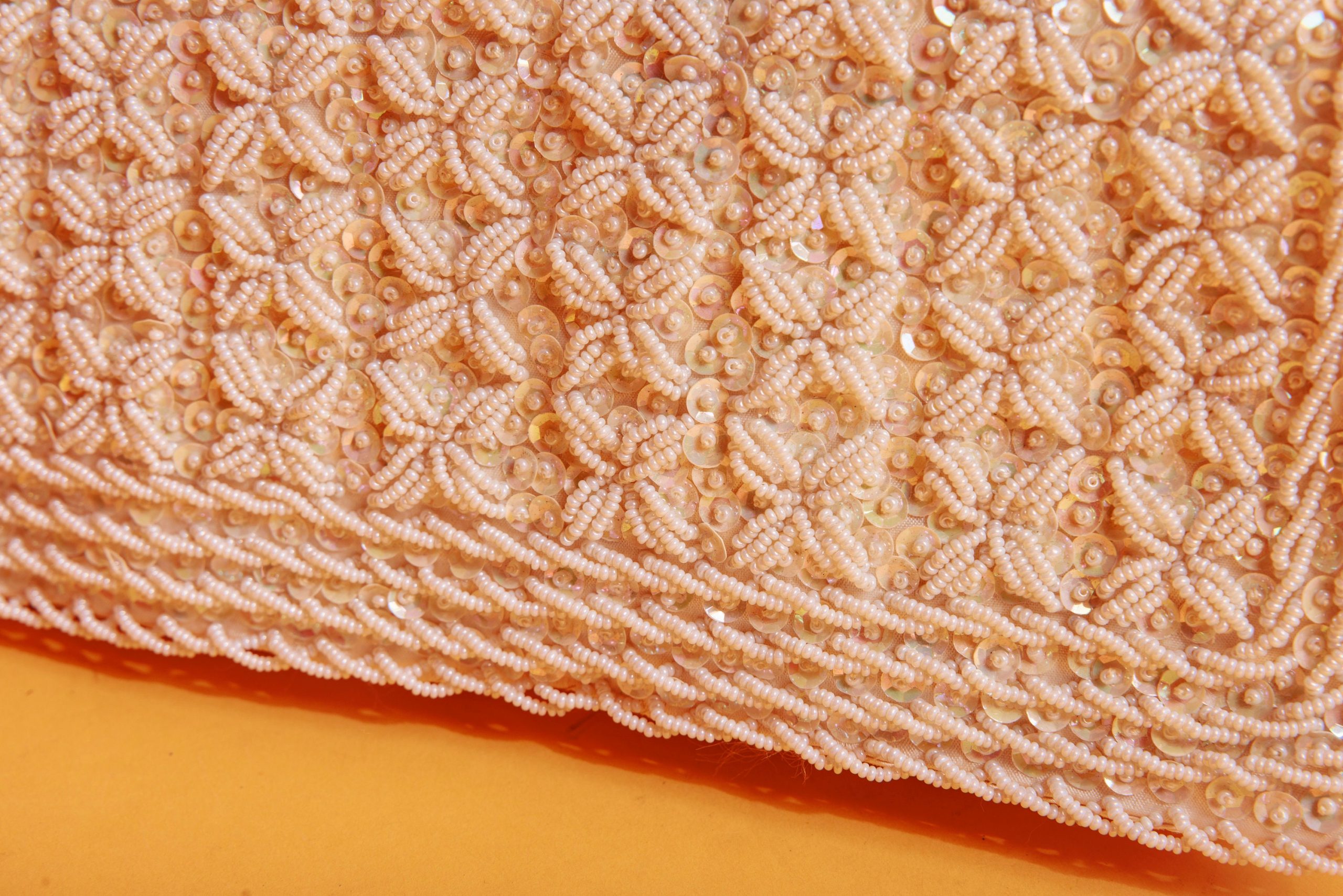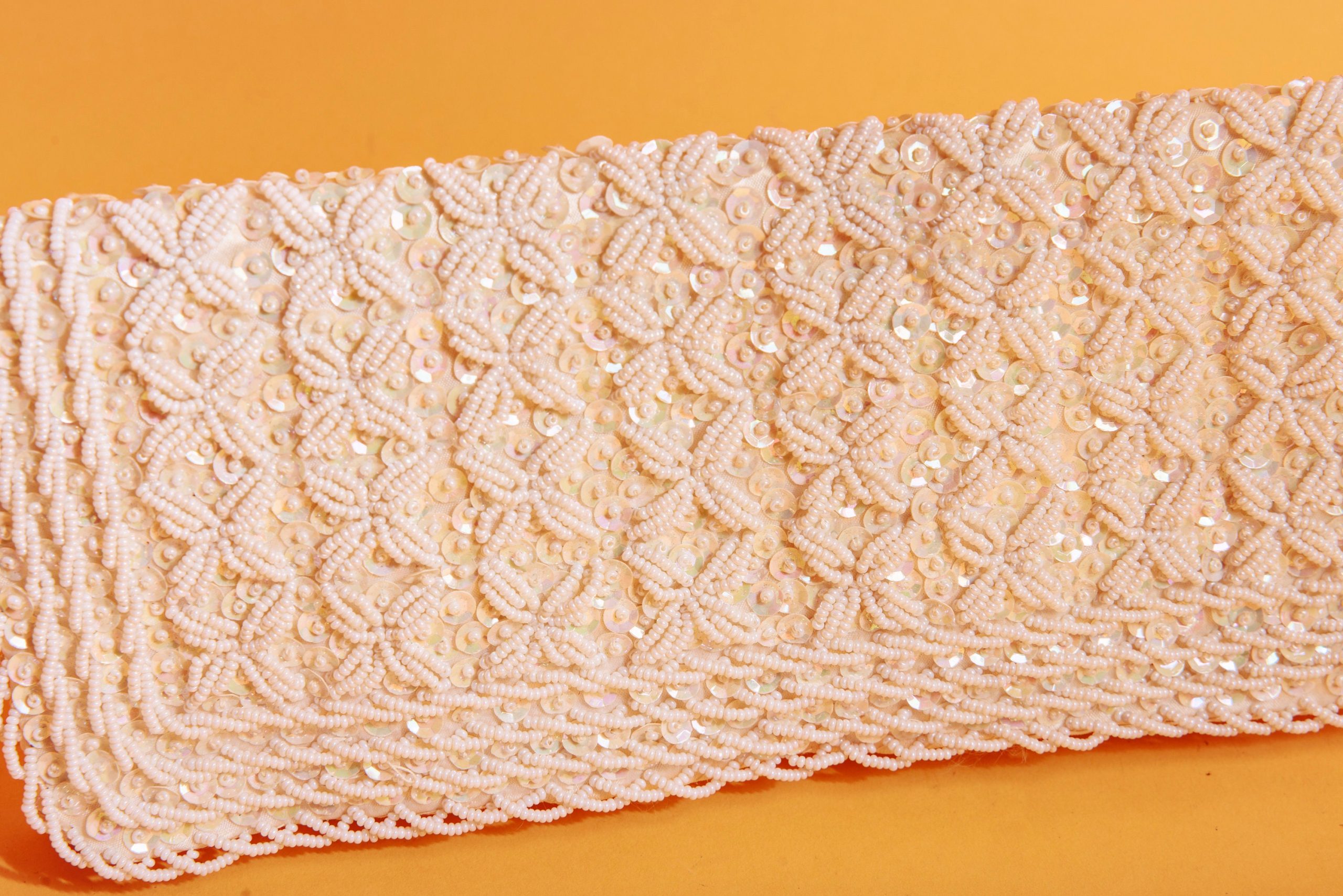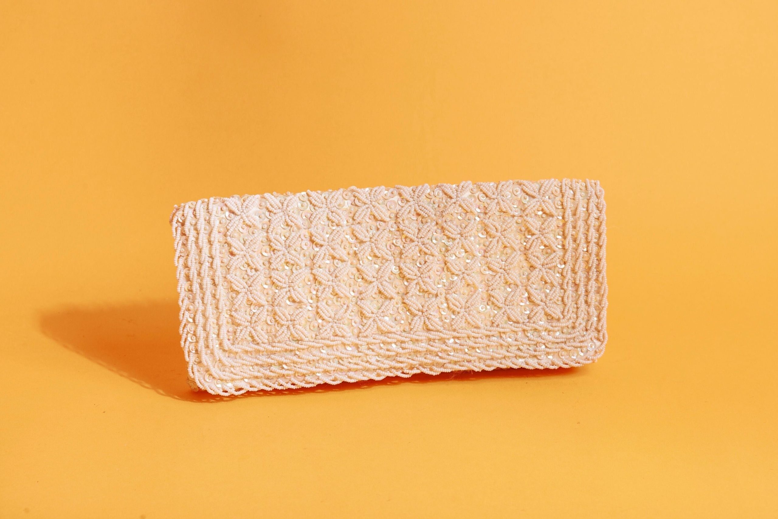 This light beige clutch is a sweet blend of romance and opulence, a delicate piece straight out of a fairytale.