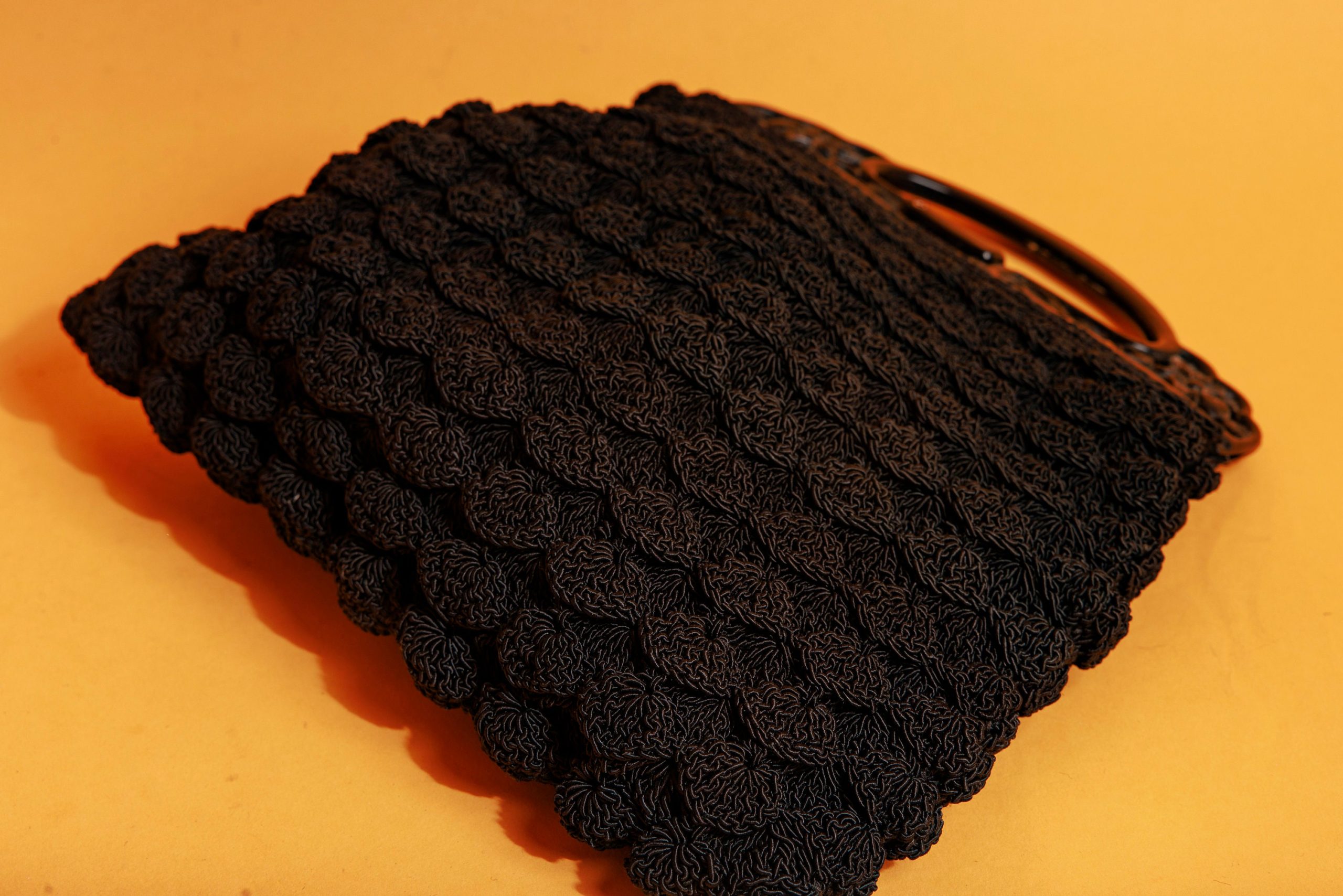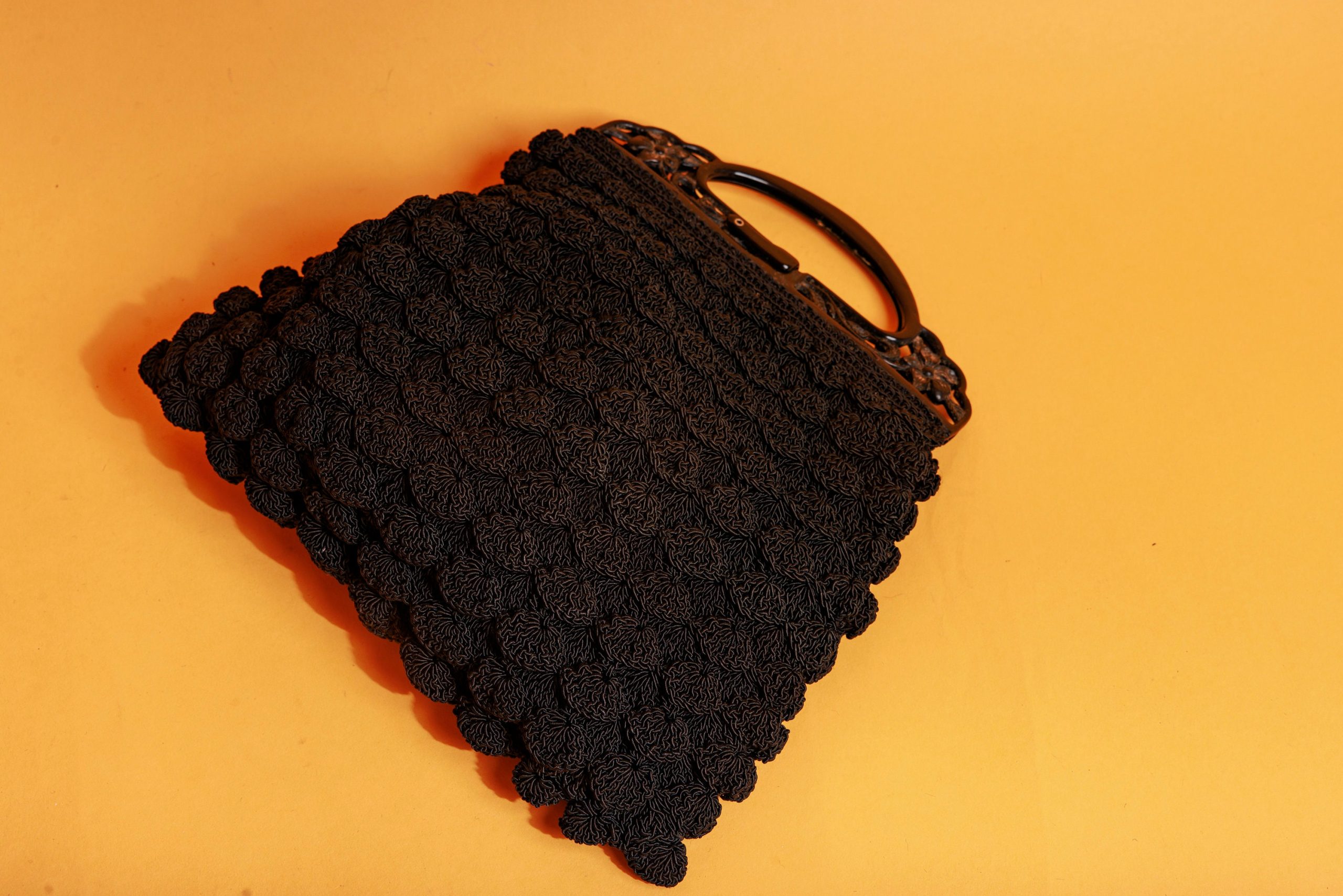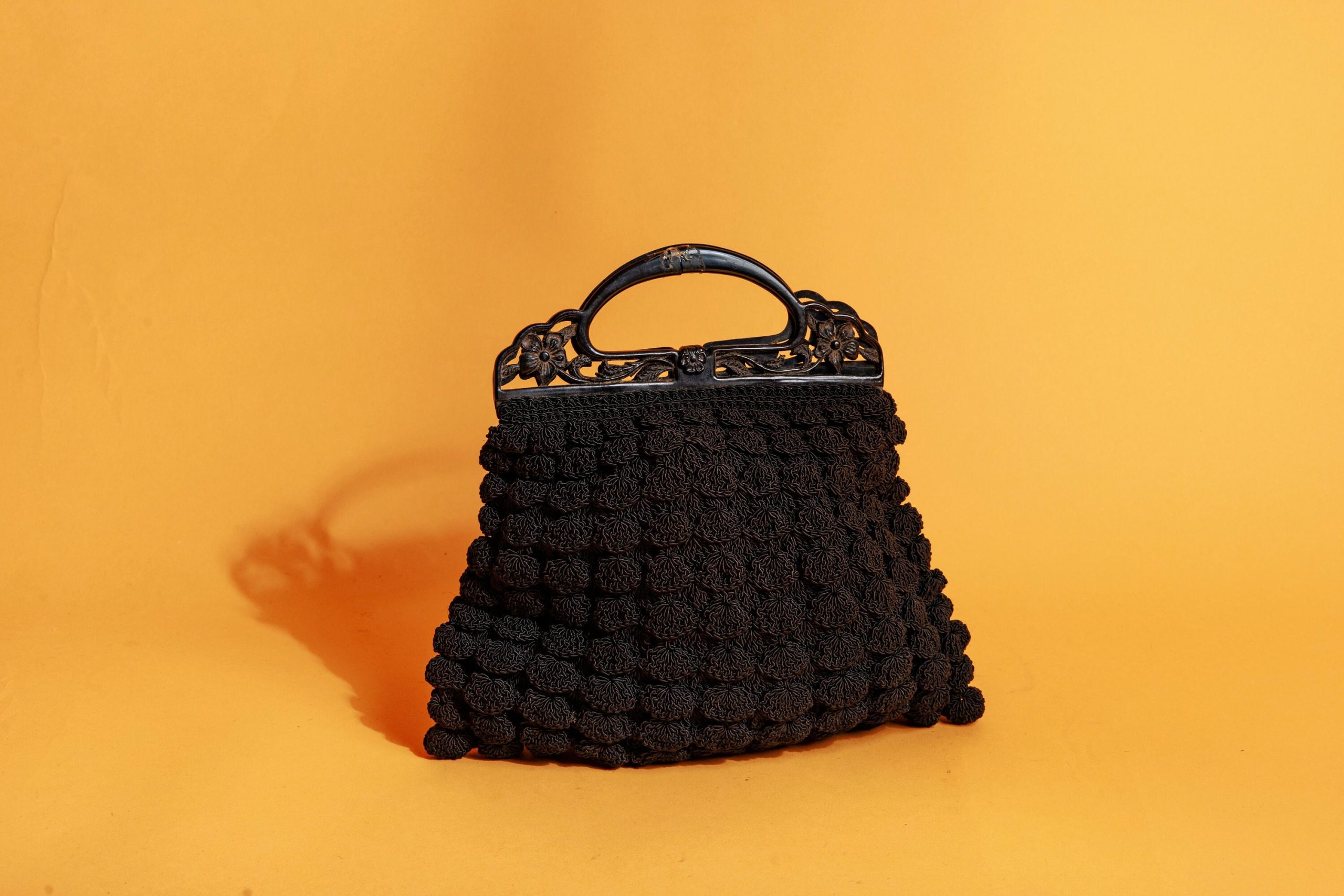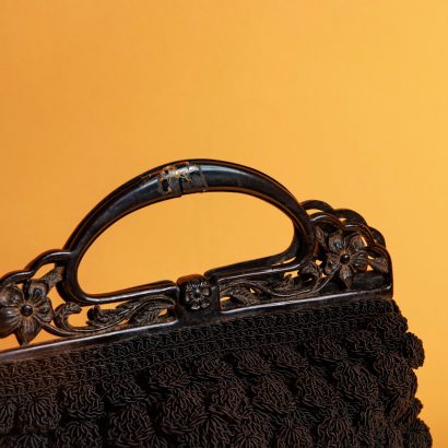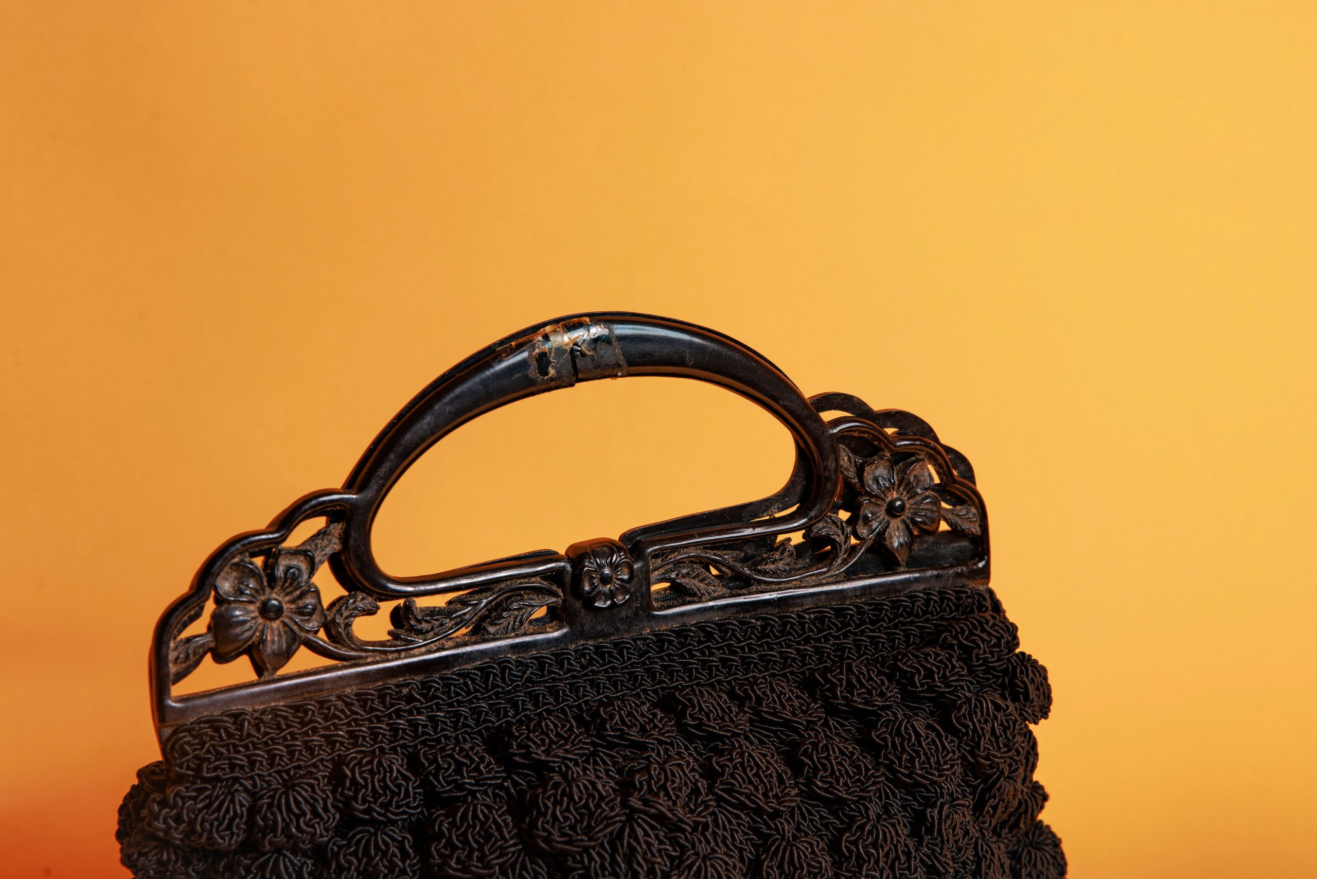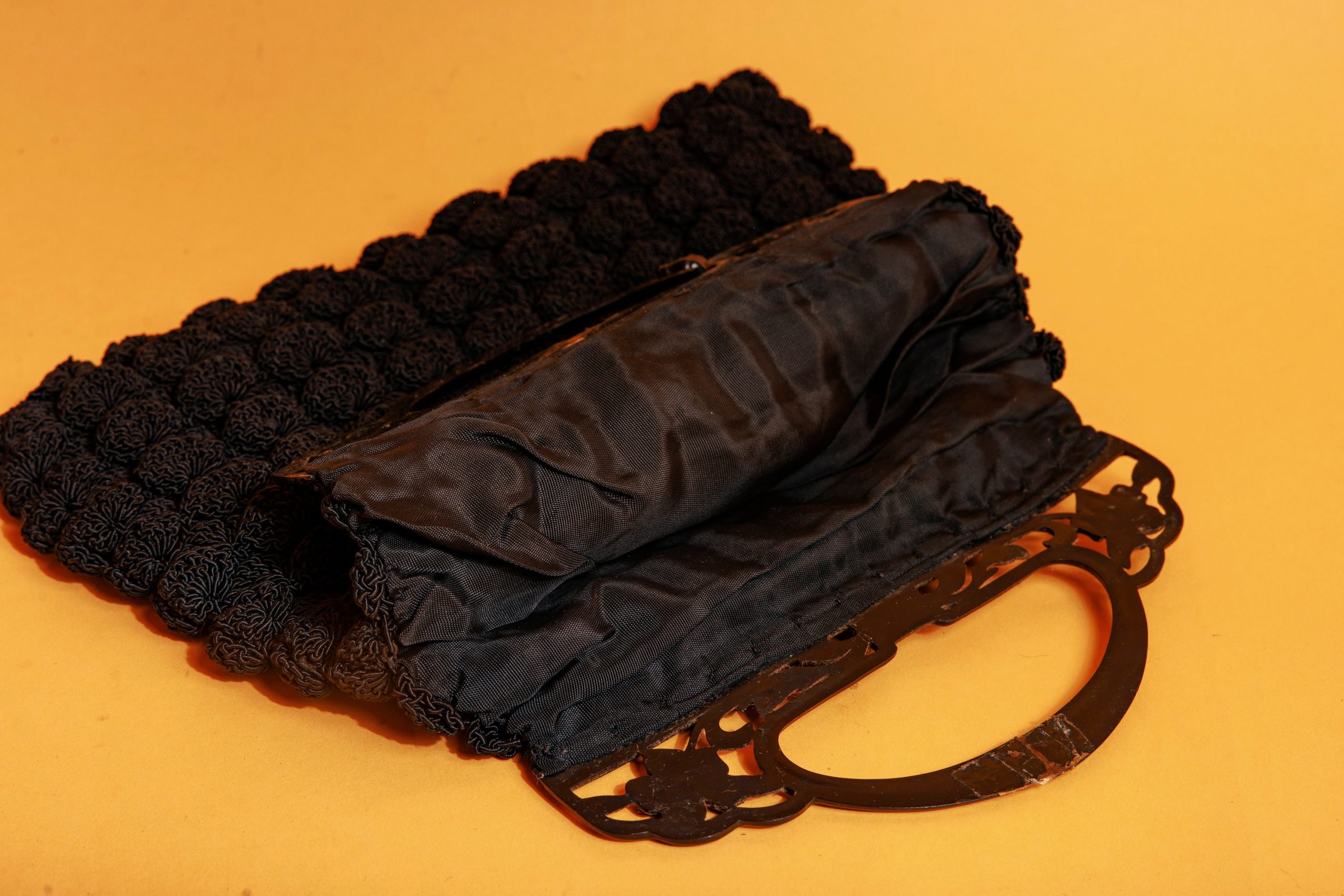 This black purse, with its unique design and thoughtful details, is a refined statement piece in a vintage style.